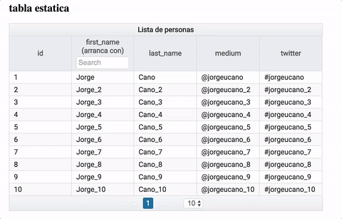 Uno de los ejemplos de filtros es el “arranca con” y de ahi podemos ver que funciona a la perfección y super rápido… ahora que tuvimos que hacer… si agregar un par mas de inputs … el html quedo así …